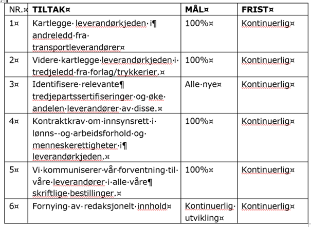 Eksisterende rutiner for innkjøpsprosesser og leverandøroppfølging er oppdatert med forsterkede tiltak for kvalifisering og kartlegging av leverandører og deres leverandørkjede. Rutinene som er etablert vil sikre oppfølging og gjennomføring av tiltak og oppnåelse av mål, og bidra til å styrke og forbedre fremtidige kartlegginger og aktsomhetsvurderinger.